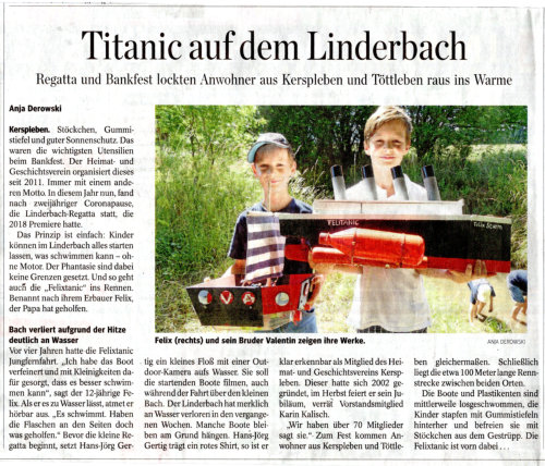 Zum zweiten Mal haben wir am ersten Juliwochenende mit viel Anteilnahme unsere "Linderbach-Regatta" durchgeführt. Mit Begeisterung haben Jung und Alt ihre unterschiedlichsten "Wasserfahrzeuge" und Plastikenten in den Linderbach gesetzt und diese von Start und Ziel lautstark begleitet. Dafür gab's am Ziel die entsprechende Belohnung. Bestes Wetter und traditionelle Verköstigung haben dieses "Bankfest" umrahmt. Sogar die Tageszeitung hat dies entsprechend gewürdigt. Siehe Ausschnit TA/TLZ vom 4.7.22